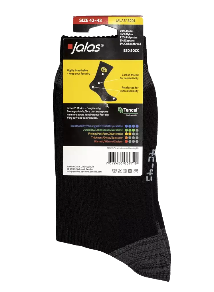 En sokk med mykt og ekstra komfortabelt fôr med perfekt passform for de som trenger ESD-beskyttelse på arbeidsplassen. Supplerer sko og hansker. Laget av svært pustende Tencel™ Modal, som holder føttene dine svale og tørre. Kan vaskes på 40 °C